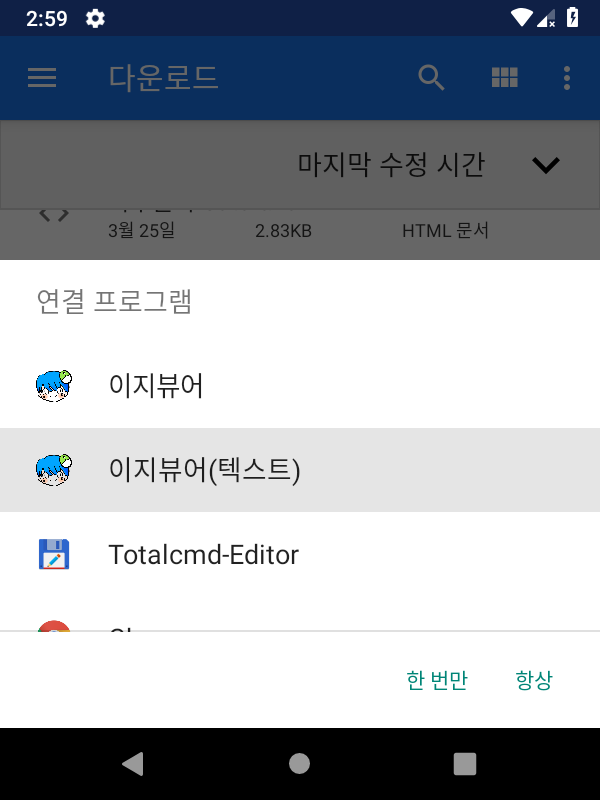 메인 액티비티외에, 텍스트뷰어 액티비티에도 정의해놨다면, 파일연결 프로그램에서 메인 액티비티와 텍스트 뷰어 액티비티 2개의 프로그램이 나오게 됩니다.