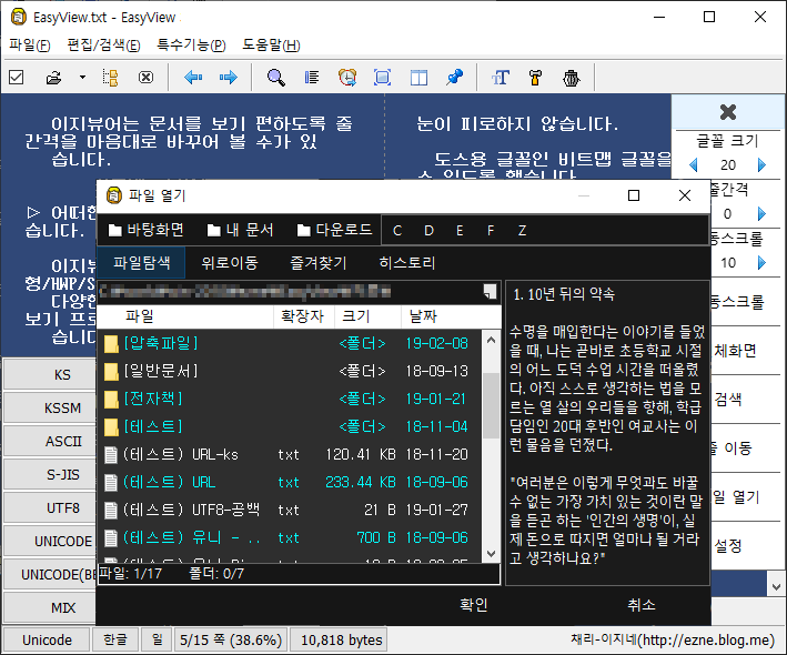 이지뷰어는 가장 빠른 조그만 텍스트 뷰어입니다. 지금이야 워낙 좋은 프로그램들이 많지만, 예전에는 문서를 읽으려고 해도 별다른 프로그램이 없었습니다. 불편한 메모장으로 읽는 것도 그렇고... 우여곡절 끝..