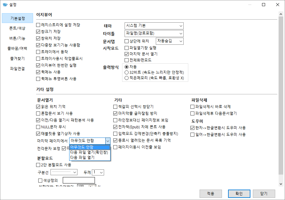 이때 이지뷰어의 다음파일 열기 설정이 [아무것도 안함]으로 되어있는 경우, 이전/다음 파일을 열지 못하게 됩니다.